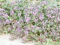 <学校の生き物たち紹介> 校舎南側の花壇では、パンジーに負けじと、ホトケノザが赤紫の小さな花を一面に咲かせています。