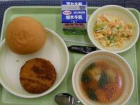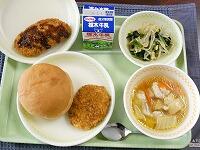 <今日の給食> 丸パン(コロッケパン)・牛乳・コロッケサンドの具・ほうれん草のサラダ・手作り肉団子スープ