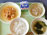 <今日の給食> ご飯・牛乳・ダッカルビ・やみつきもやし・わかめスープ