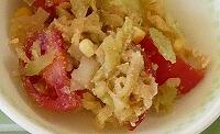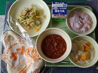 <今日の給食> ナン・牛乳・トマトドライカレー・キャベツとコーンのソテー・フルーツババロア