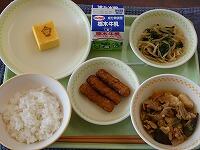 <今日の給食>【とち介ランチ】ご飯・牛乳・味噌すき焼き煮・とち介卵焼き・にらともやしのお浸し
