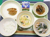 <今日の給食> ご飯・牛乳・麻婆なす・揚げぎょうざ・中華風卵とコーンのスープ