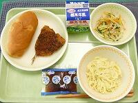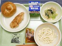<今日の給食> ミニ米粉パン・牛乳・冷やしうどん・めんつゆ・刻みのり・ささみの竜田揚げ・梅和え