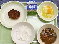 <今日の給食> ご飯(カレーライス)・牛乳・夏野菜カレー・キャベツのメンチカツ・マスカットのジュレポンチ