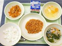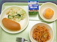 <今日の給食> ミニミルクパン・牛乳・なすとトマトのスパゲティ・シーザーサラダ・冷凍みかん