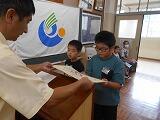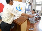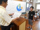 まず終業式に先立ち、表彰を行いました。今学期、学校に届いた賞状を授与しました。