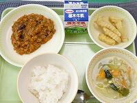 <今日の給食> ご飯(ドライカレー)・牛乳・ビーンズドライカレーの具・フライドポテト・野菜スープ