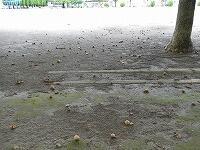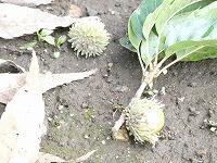 <学校の生き物たち紹介> 夏休みの間、少しずつ大きくなってきたトチノキやクヌギの実が、強風雨によって落とされて、地面にたくさん転がっていました。