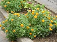 <学校の生き物たち紹介> 校舎北側の花壇では、春先に咲き始まったマリーゴールドが、黄色やオレンジ色の鮮やかな花を咲かせ続けています。