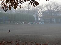 日中、暖かくなりそうな予兆として、校庭には、霧が立ちこめていました。