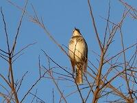 <学校の生き物たち紹介> 久し振りに鳴き声がするなと思って見上げると、すっかり葉を落としたエノキのてっぺんで、冬の使者ツグミが囀っていました。