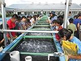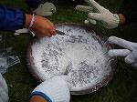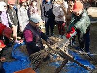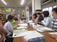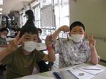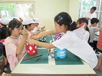 針に糸を通すだけでも一苦労,うまく糸をより合わせて玉結びをするのはもっと大変そうで,何度も何度も練習しました。ボランティアの方にお手伝いしていただき,玉どめもできるようになりました。