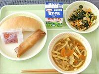 <今日の給食>【歯と口の衛生週間献立】ミニコッペパン・いちごミックスジャム・牛乳・春巻・かんぴょうのごま和え