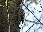 この鳥は、キツツキ目キツツキ科のコゲラです。木を突きながら採餌している様子も観察することができました。(コゲラの左側の黒っぽい小さい丸の部分が、採餌するためドラミングをして開けた穴です。)