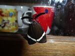 これからの季節、せせらぎのあるところでは鑑賞会が行われたりする「ホタル」に似ています。そして、羽を広げて止まっているので「ガ」の仲間です。もう、名前も予想できたのではないでしょうか。そうです、この昆虫の名前は、ホタルガ(チョウ目マダラガ科)です。捕獲して外に逃がしたら、偶然、窓ガラスに止まってくれたため、なかなか見られない腹側の様子も観察できました。