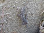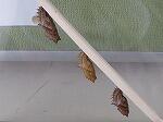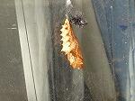 なんと、先日のこのコーナーで紹介した ツマグロヒョウモン というチョウの幼虫が、逆さになってぶら下がっていたのです。2、3日、玄関前のプランターで見掛けなくなったなあと思っていたら、こんなところで、さなぎになる準備をしていたのです。