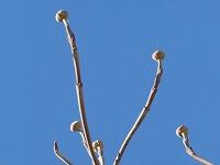 <学校の生き物たち紹介> 校舎前のハナミズキも、すっかり葉を落とし、枝先には、春の訪れに備えて丸みのある新芽をたくさん付けています。