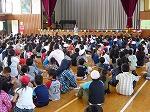 2~5年生が待つ体育館に、6年生に手を引かれながら1年生が入場しました。