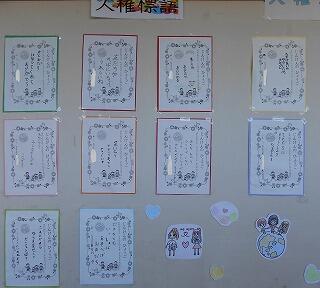 12月2日(月)~6日(金)は、校内人権週間です。全児童は人権に関する標語、また3年生以上は人権書道も作成し、それぞれの代表は1階に掲示しました。また、6年生代表児童が「SNS 書きこむ前に考えて」の作文をお昼の放送で発表しました。12月6日(金)には、人権集会と称して、夏休みに行われた栃木市の人権フォーラムに参加した6年生代表児童が、その内容や感想を発表し、その後、各学級で人権に関するテーマで話合いをもつ予定です。