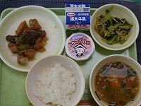 <今日の給食> コーン茶飯・牛乳・鶏肉のスタミナ焼き・切り干し大根のごま酢和え・豆腐とわかめの味噌汁・冷凍みかん