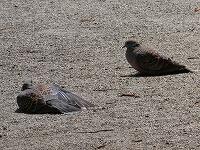 < 学校の生き物たち紹介 > 熱くなっているであろう校庭を散歩したり、砂浴びをしているキジバトの番(?)。