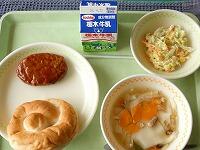 <今日の給食> 米粉パン・牛乳・ハンバーグケチャップソース・コールスローサラダ・ワンタンスープ