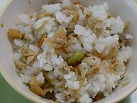 <今日の給食> コーン茶飯・牛乳・鰹の揚げ煮・もやしのソテー・雷汁・刻みのり