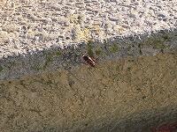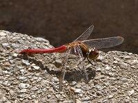 <学校の生き物たち紹介> 校舎の校庭側の犬走りで、アキアカネと思われる真っ赤なトンボが羽を休めていました。