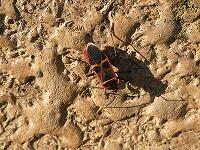 <学校の生き物たち紹介> 今朝の校庭巡回中、地面に大きな穴と掻き出された土の跡を見つけ、穴から土を抱えて出てくるクロアナバチに出会いました。