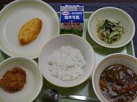 <今日の給食> コッペパン・岩舟産にっこりジャム・牛乳・タンドリーチキン・ジャーマンポテト・トマトとあさりのスープ