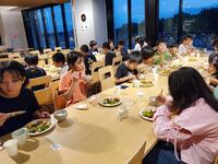 きれいな食堂で夕食をおいしくいただきました。これから順番にお風呂に入ります。参加者全員が元気に生活しています。