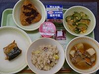 <今日の給食>【南中リクエスト献立】さつま芋ご飯・ごま塩・牛乳・鯖の味噌煮・こんにゃくサラダ・豚汁・リンゴゼリー