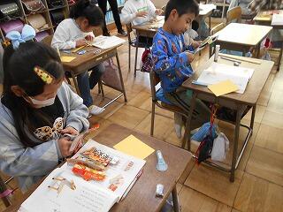 11月21日(火)の3・4校時に、2年3組で国語の授業が公開されました。説明文「馬のおもちゃの作り方」を読んで、説明の仕方の工夫を見付ける授業でした。教師が意図的に失敗した馬のおもちゃ作りを演示し、文章をしっかり読むことが必要であることを意識付けました。その後、馬のおもちゃを実際に作りながら、詳しく読んだところや分かりやすかったところに線を引きました。
