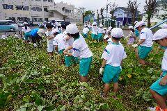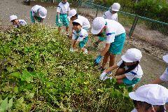 今日は、2年生がサツマイモ畑の草取りとつる返しを行いました。