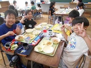 1学期の後半から学級の実態に応じて、グループ給食を始めるようにしています。これまで感染症予防の為、全学級で前向きで食べていましたが、決められた時間のあとは、友だちといろいろな話をしながら給食を楽しむことができるようになりました。本日の給食は「生ぶどう献立」で、シャインマスカットがだされましたが、口々に「甘くておいしいね」とにっこりと笑顔で話していました。今は、週1回や月1回の学級が多いですが、少しずつ以前のような給食スタイルに戻していきたいです。