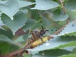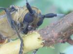 また、正門前のケヤキの枝に、色が変わっている部分があることに気付いて目を移していったところ、大型のカミキリムシ、クワカミキリを発見することができました。