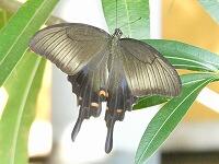 <学校の生き物たち紹介> 朝の校地巡回中、体育館北側の観察園で、キョウチクトウに止まって羽を休めているカラスアゲハ(のメス?)と出会いました。