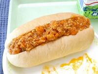 <今日の給食> コッペパン(ミートサンド)・牛乳・ミートサンドの具・フライドポテト・ABCマカロニスープ