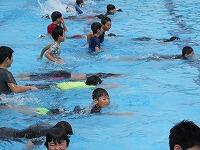 水慣れをした後、普段着のまま水の中に入って、まとわりついて動きにくかったり、水に濡れて重かったりすることを体感しました。