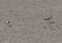 <学校の生き物たち紹介> 朝、聞き慣れない鳴き声を追っていると、コチドリ2羽が校庭に降り立って、地面を突いていました。(実物との初めての出会いでした!)