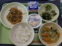 <今日の給食> ご飯・牛乳・チンジャオロースー・豆腐サラダ・しょう油・餃子スープ
