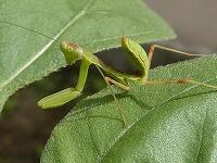 <学校の生き物たち紹介> ヒマワリの葉の上で、警戒ポーズをとるハラビロカマキリの幼虫。