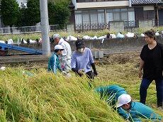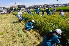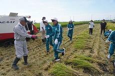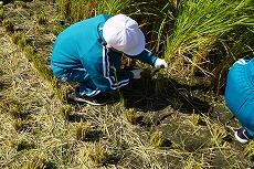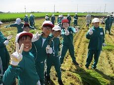 春に稲を植えた田には、、たくさんの実(米)がなりました。5年生が、その一部の稲刈りをお手伝いしました。