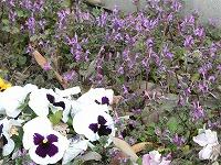 <学校の生き物たち紹介> 校舎南側の花壇では、パンジーに負けじと、ホトケノザが赤紫の小さな花を一面に咲かせています。