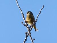 <学校の生き物たち紹介> 朝の校庭巡回中、校庭南側のソメイヨシノの枝先で羽を休めるカワラヒワの群れに出会いました。