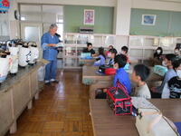 国語の授業後の4校時には、近くの谷口運送の皆様にご協力をいただき、1年生全員が13tの大型トラックを昇降口前で見学させていただきました。1年生全員がのってもまだ半分くらいスペースがある広い荷台に驚いている様子がみられました。重くてたくさんの荷物を積むために、タイヤの数も普通の車より大きく太いタイヤがたくさんついていることも分かりました。「じどう車くらべ」から読み取った内容を、実際に目にしてふれることのできた貴重な体験となりました。谷口運送の皆様、大変ありがとうございました。