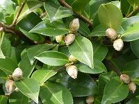 <学校の生き物たち紹介> 観察園に続いて、校地北側のフェンス沿いで、サザンカがたくさんの花を咲かせ始めています。
