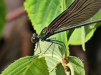 <学校の生き物たち紹介> 体育館北側の観察園の草に停まって休んでいるハグロトンボ。