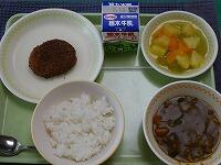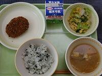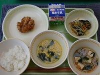 <今日の給食> わかめご飯・牛乳・コロッケ・レモン酢和え・根菜のごま汁
