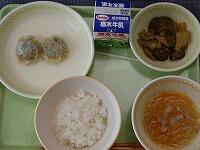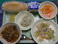 <今日の給食> ご飯・牛乳・にら饅頭・豚肉となすの味噌カレー炒め・春雨スープ